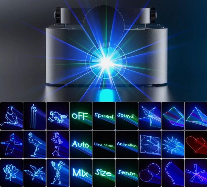 De laser werkt volledig automatisch, op muziek of via een DMX-lichtsturing. Hierdoor is hij flexibel inzetbaar: van kleine feestjes tot professioneel podiumgebruik. Dankzij de stevige metalen behuizing en ingebouwde ventilator is hij ook geschikt voor langdurig gebruik.